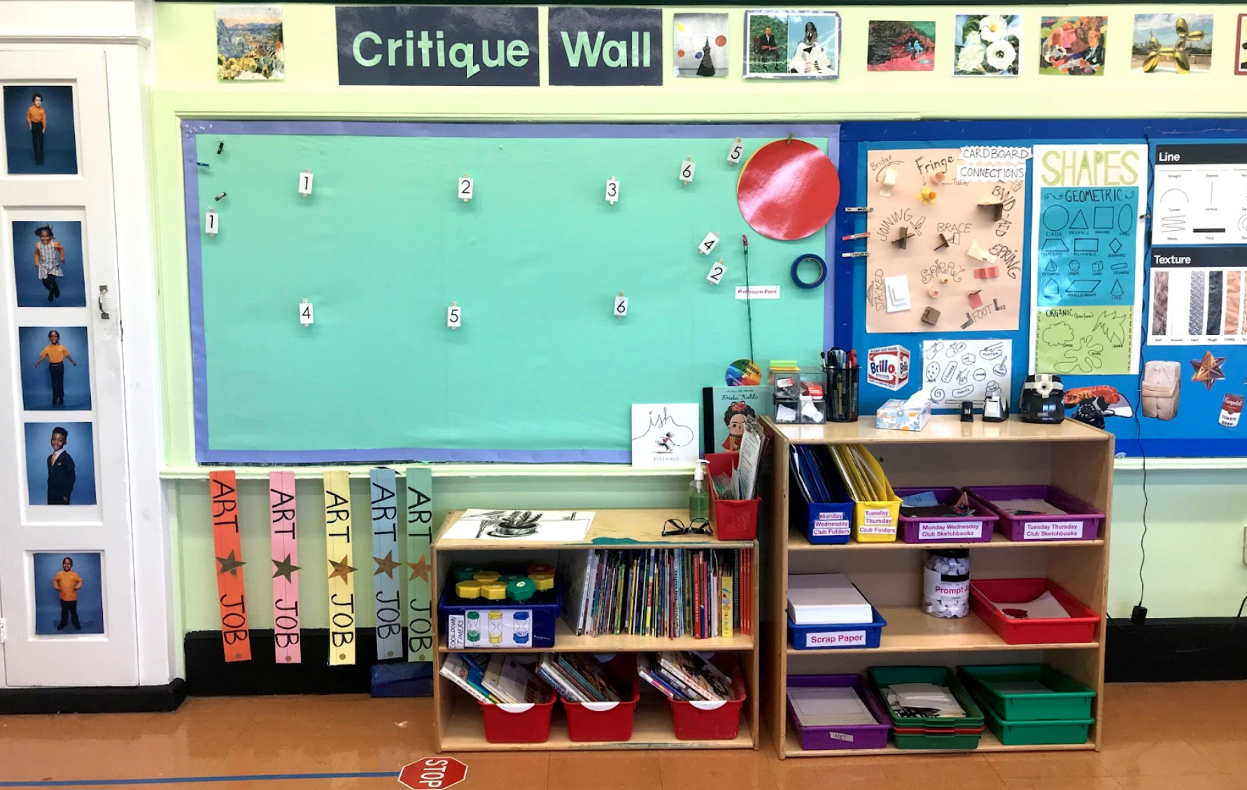 Classroom photo: Students share their work on the critique wall and practice explaining their artistic choices to their peers.